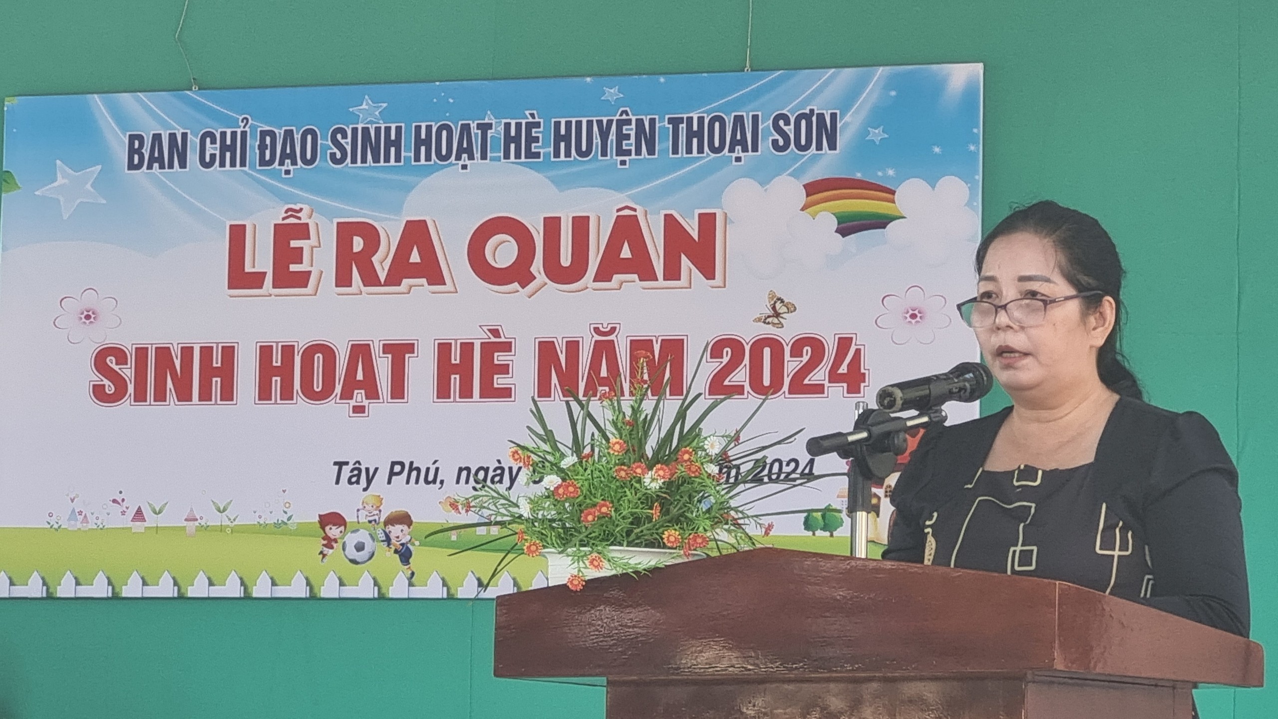 Sáng ngày 8/6/2024, tại xã Tây Phú. Ban Chỉ đạo sinh hoạt hè huyện Thoại Sơn tổ chức Lễ ra quân sinh hoạt hè năm 2024. Tham dự có ông Lâm Sơn Nam – Phó Trưởng Ban Tuyên giáo, Tỉnh đoàn An Giang, Bà Nguyễn Thị Kim Chi – Phó Chủ tịch UBND huyện, Trưởng Ban Chỉ đạo sinh hoạt hè huyện Thoại Sơn. Cùng  với thành viên Ban chỉ đạo sinh hoạt hè các xã, Thị trấn trên địa bàn huyện, Ban chỉ đạo sinh hoạt hè xã Tây Phú và hơn 100 em học sinh cùng tham dự lễ ra quân.