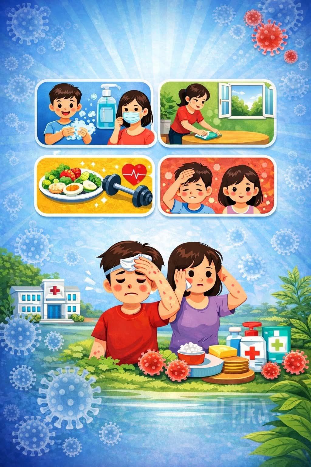Thực hiện tốt vệ sinh môi trường, tăng cường thông khí tại nơi ở, học tập và làm việc; lau sạch bề mặt, dụng cụ tiếp xúc hàng ngày (tay nắm cửa, mặt bàn, đồ chơi...) bằng xà phòng hoặc chất tẩy rửa thông thường.