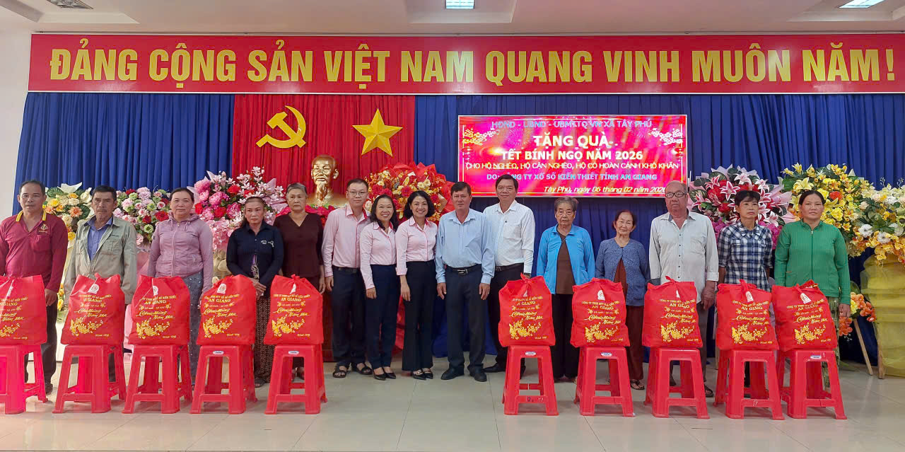 Trước thềm xuân Bính Ngọ năm 2026, sáng ngày 6/2/2026, Công ty TNHH MTV Xổ số Kiến thiết tỉnh An Giang phối hợp với Ủy ban MTTQ Việt Nam xã Tây Phú tổ chức chương trình trao quà tết cho hộ nghèo, cận nghèo, hộ có hoàn cảnh khó khăn trên địa bàn xã.