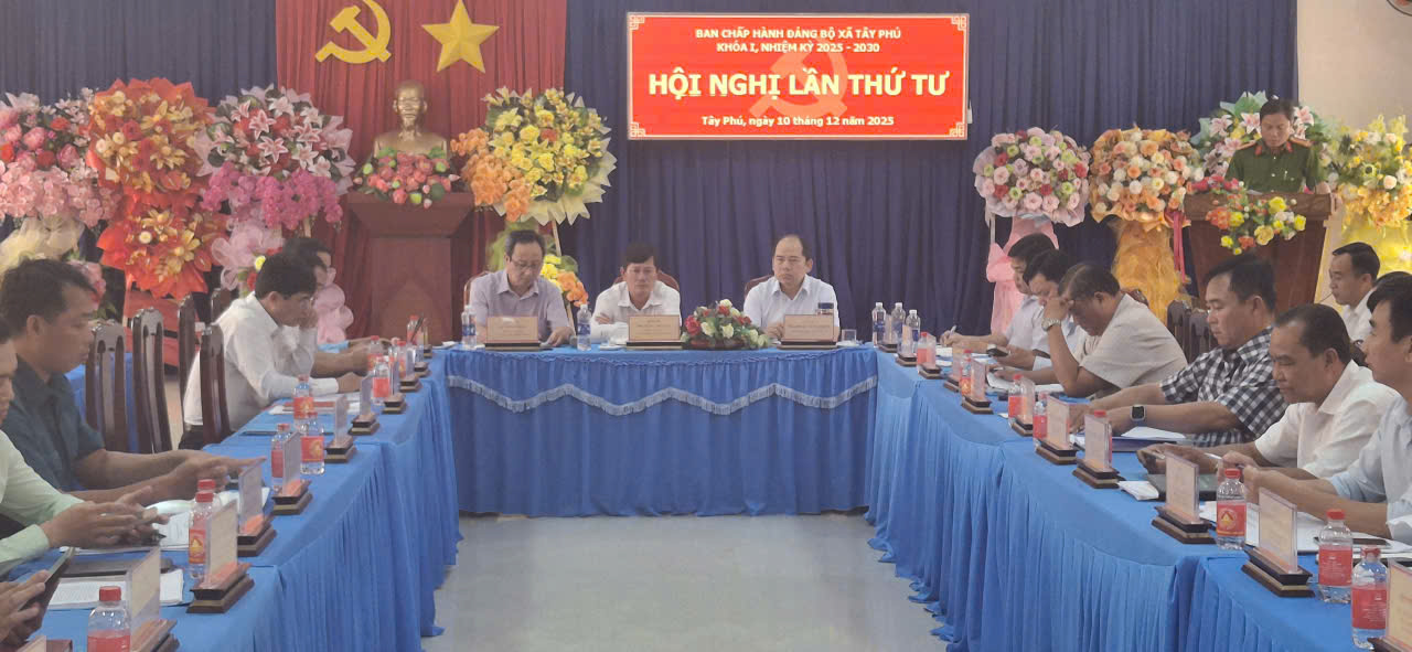Ban Chấp hành Đảng bộ xã Tây Phú khóa I, nhiệm kỳ 2025 – 2030 vừa tổ chức Hội nghị lần thứ tư. Tham dự hội nghị có đồng chí Nguyễn Hữu Ngọc – Phó Trưởng Ban Tuyên giáo và Dân vận Tỉnh ủy; đồng chí Phạm Quang Căn – Bí thư Đảng ủy, Chủ tịch HĐND xã; đồng chí Phạm Quyết Chiến – Phó Bí thư Thường trực Đảng ủy; cùng các đồng chí trong Ban Thường vụ, Ban Chấp hành Đảng bộ; lãnh đạo các ban, ngành, đoàn thể; đại diện các đơn vị, điểm trường và các ấp trên địa bàn xã.