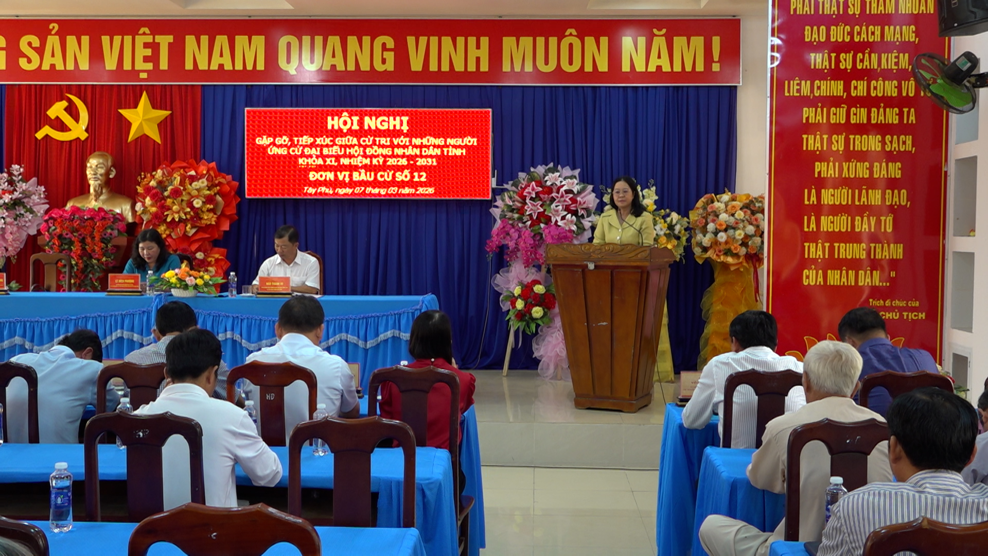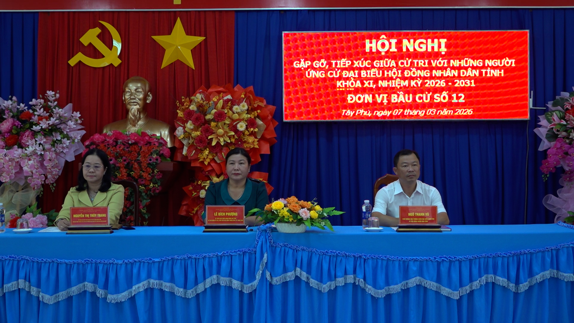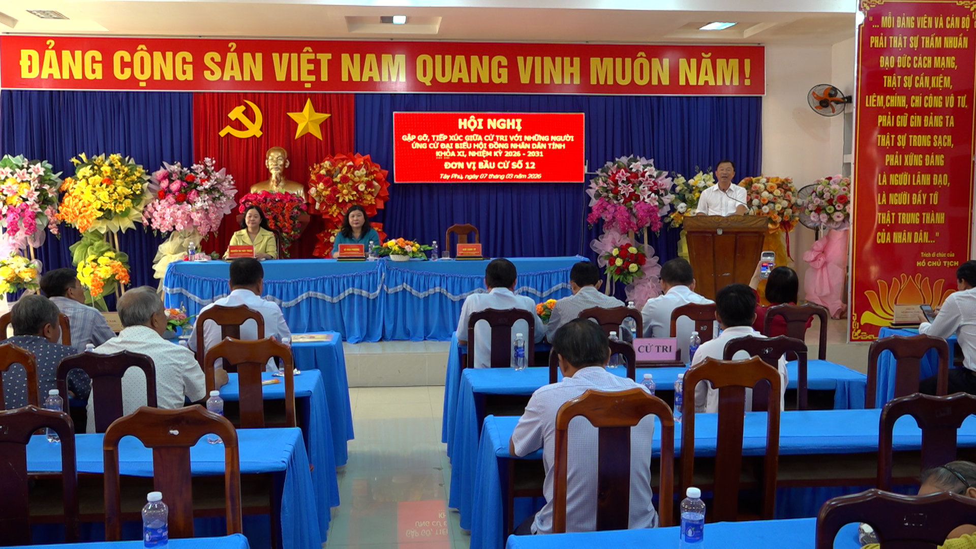 Ngày 07/3/2026, tại Hội trường UBND xã Tây Phú, Ủy ban MTTQ Việt Nam tỉnh An Giang phối hợp với Ủy ban MTTQ Việt Nam xã Tây Phú tổ chức Hội nghị gặp gỡ, tiếp xúc cử tri với những người ứng cử đại biểu HĐND tỉnh An Giang nhiệm kỳ 2026–2031, thuộc đơn vị bầu cử số 12.