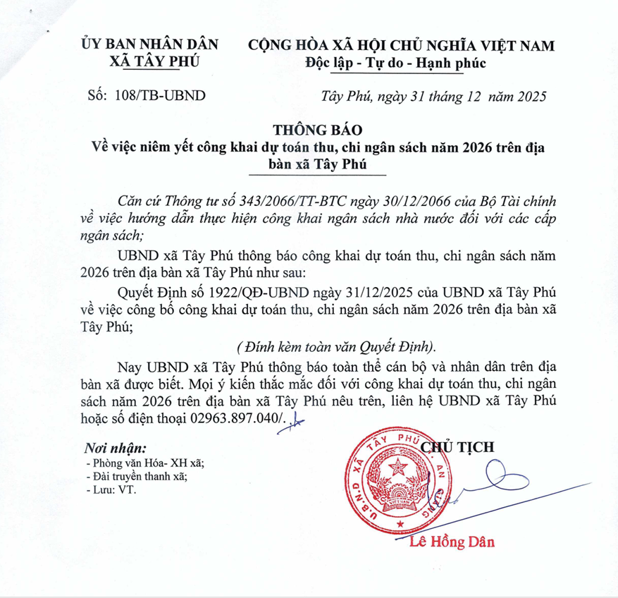THÔNG BÁO NIÊM YẾT CÔNG KHAI DỰ TOÁN THU CHI NGÂN SÁCH NĂM 2026 TRÊN ĐỊA BÀN XÃ TÂY PHÚ