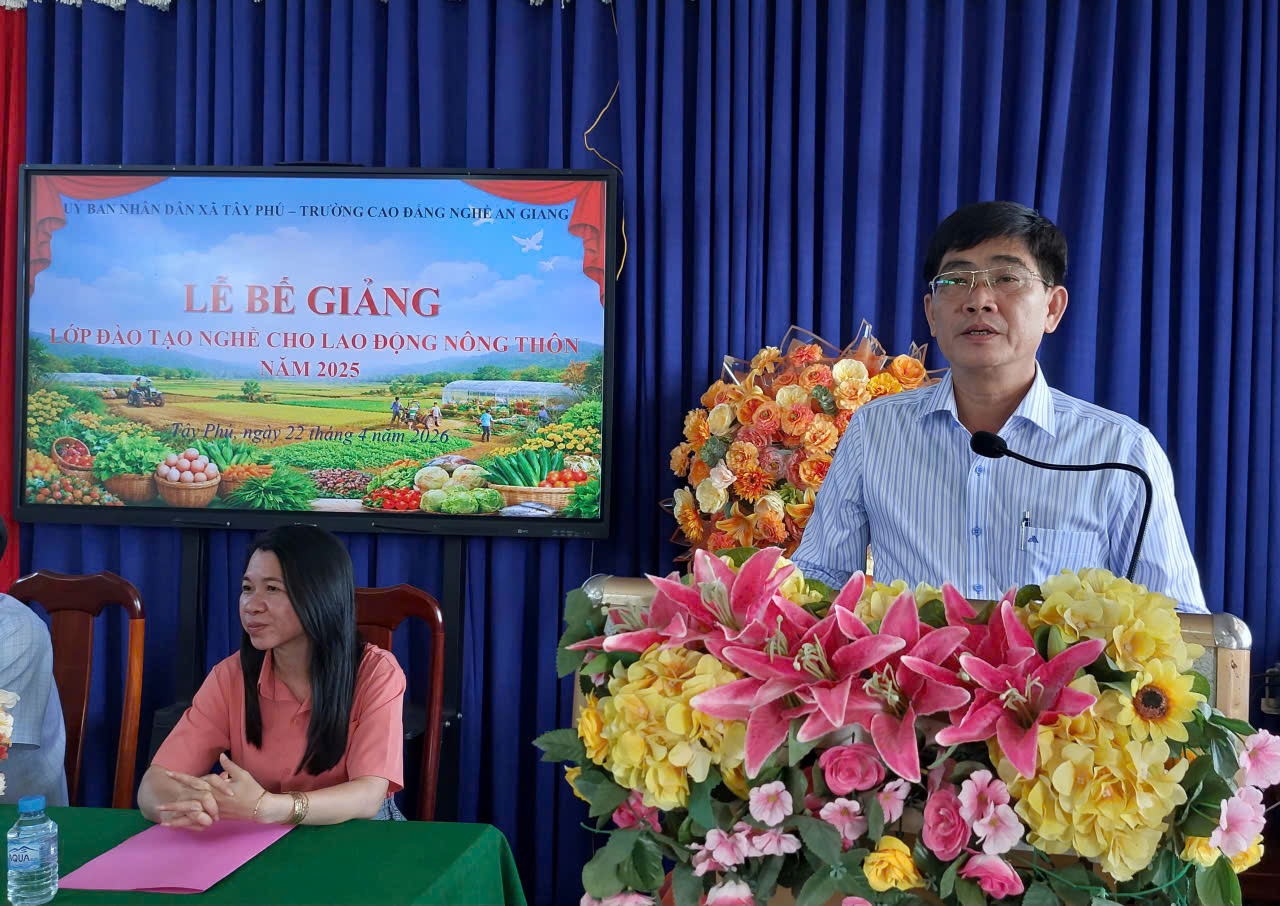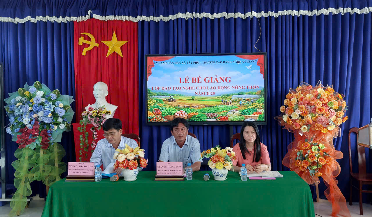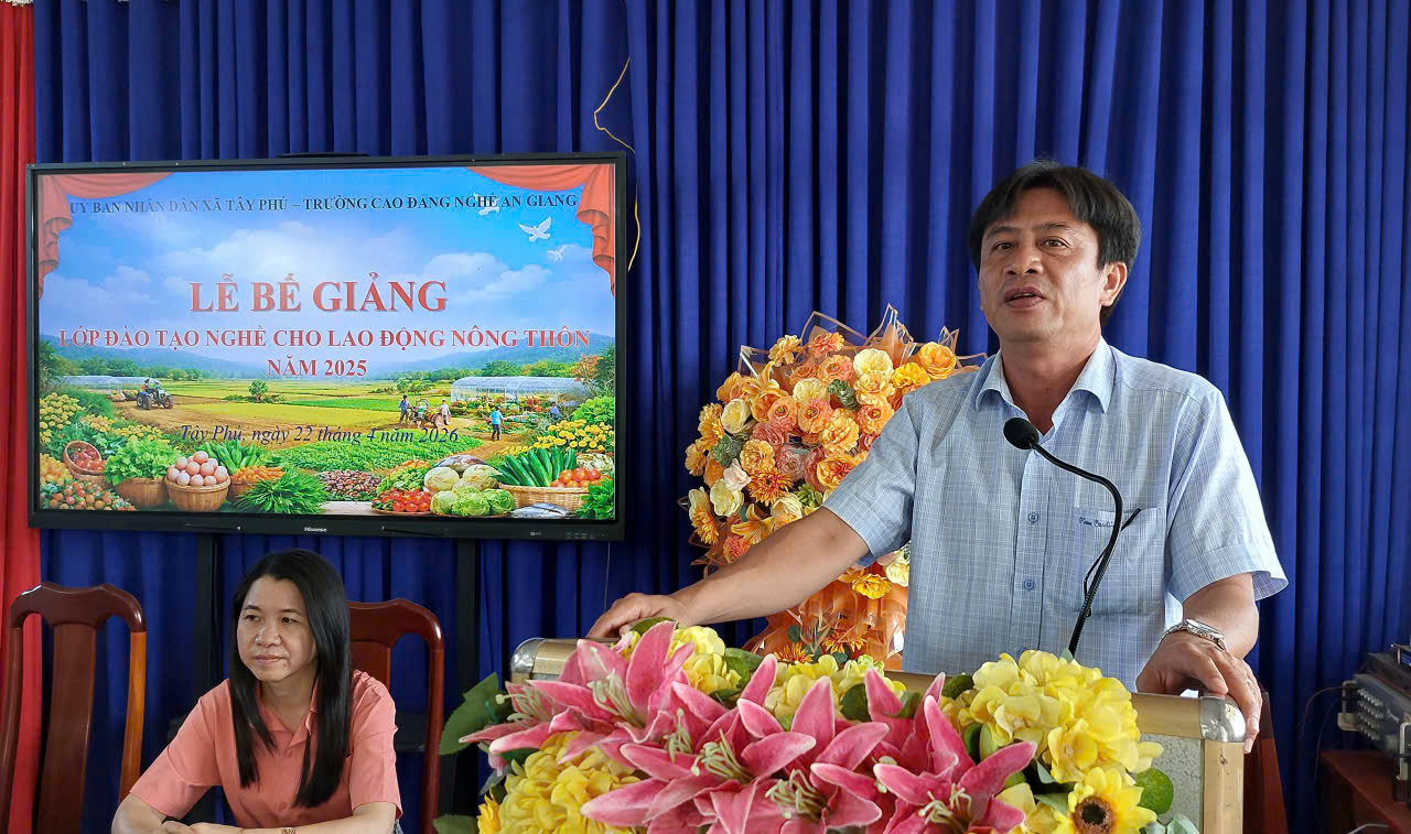 Sáng ngày 22/4/2026, xã Tây Phú phối hợp với Trường Cao đẳng nghề An Giang tổ chức bế giảng lớp tin học cơ bản, kỹ năng bán hàng và tiếp thị cơ bản. Tham dự có ông Nguyễn Thành Sang – Trưởng Phòng đào tạo – Nghiên cứu khoa học Trường Cao đẳng nghề An Giang, ông Nguyễn Thanh Tuấn – Phó Chủ tịch UBND xã cùng các học viên.