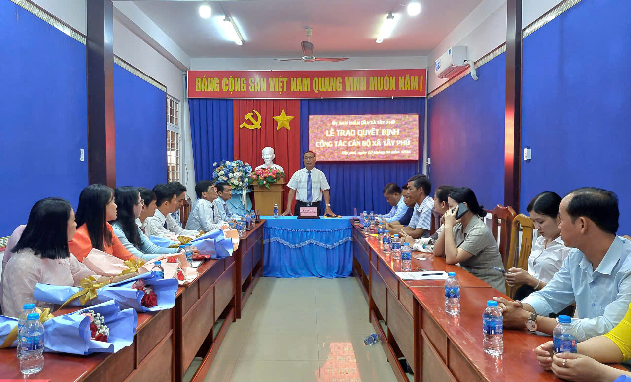 Chiều ngày 02/4/2026, UBND xã Tây Phú tổ chức lễ công bố và trao quyết định về công tác cán bộ. Tham dự có đồng chí Lê Hồng Dân – Phó Bí thư Đảng ủy, Chủ tịch UBND xã; đồng chí Trần Văn Thơm – Phó Chủ tịch HĐND; đồng chí Nguyễn Thanh Tuấn – Phó Chủ tịch UBND xã cùng đại diện lãnh đạo các cơ quan chuyên môn tham dự.